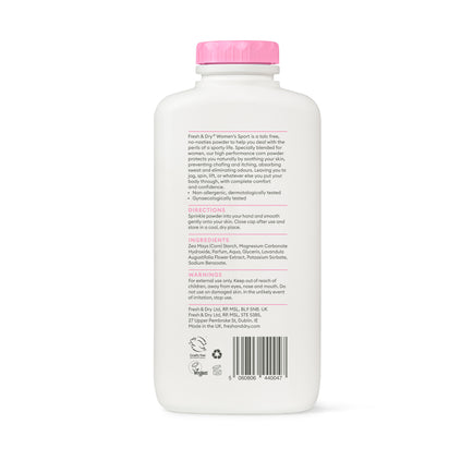 Fresh & Dry Women's Sport is a talc free, no-nasties powder to help you deal with the perils of a sporty life. Specially blended for women, our high performance corn powder protects you naturally by soothing your skin, preventing chafing and itching, absorbing sweat and eliminating odours. Leaving you to jog, spin, lift or whatever else you put your body through, with complete comfort and confidence.